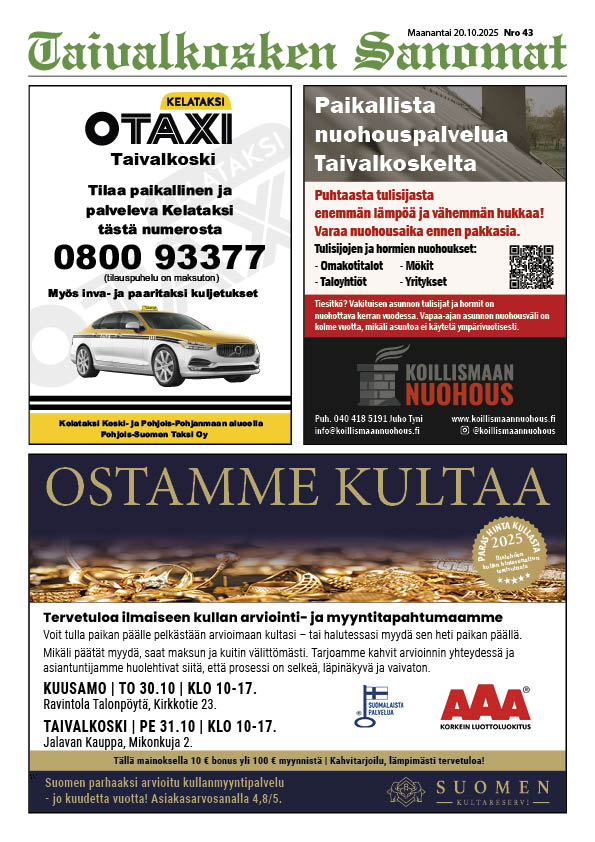 Taivalkosken Sanomat Ma 20.10.2025 Nro 43 Image By admin 2025, Lehti, Lokakuu Selaa lehteä Lataa pdf-tiedostona